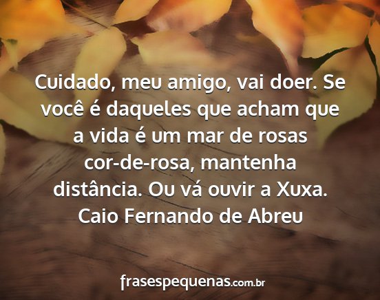 Cuidado, meu amigo, vai doer. Se você é daqueles que acham que a vida é um mar de rosas cor-de-rosa, mantenha distância. Ou vá ouvir a Xuxa.Caio Fernando de Abreu
