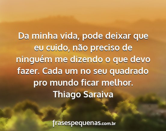 Da minha vida, pode deixar que eu cuido, não preciso de ninguém me dizendo o que devo fazer. Cada um no seu quadrado pro mundo ficar melhor.Thiago Saraiva