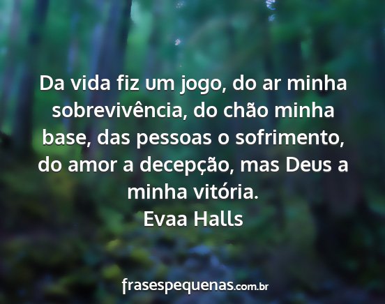 Da vida fiz um jogo, do ar minha sobrevivência, do chão minha base, das pessoas o sofrimento, do amor a decepção, mas Deus a minha vitória.Evaa Halls