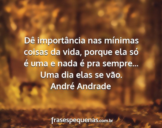 Dê importância nas mínimas coisas da vida, porque ela só é uma e nada é pra sempre... Uma dia elas se vão.André Andrade