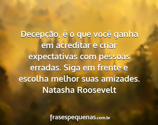 Decepção, é o que você ganha em acreditar e criar expectativas com pessoas erradas. Siga em frente e escolha melhor suas amizades.Natasha Roosevelt