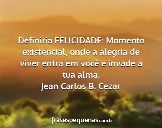 Definiria FELICIDADE: Momento existencial, onde a alegria de viver entra em você e invade a tua alma.Jean Carlos B. Cezar