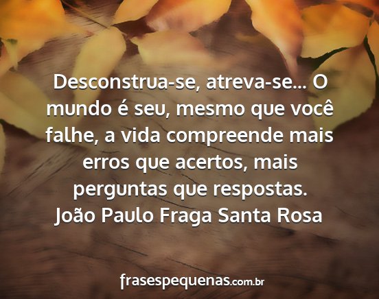 Desconstrua-se, atreva-se... O mundo é seu, mesmo que você falhe, a vida compreende mais erros que acertos, mais perguntas que respostas.João Paulo Fraga Santa Rosa
