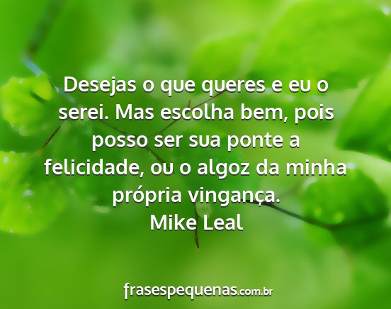 Desejas o que queres e eu o serei. Mas escolha bem, pois posso ser sua ponte a felicidade, ou o algoz da minha própria vingança.Mike Leal