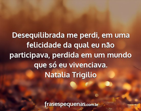 Desequilibrada me perdi, em uma felicidade da qual eu não participava, perdida em um mundo que só eu vivenciava.Natalia Trigilio