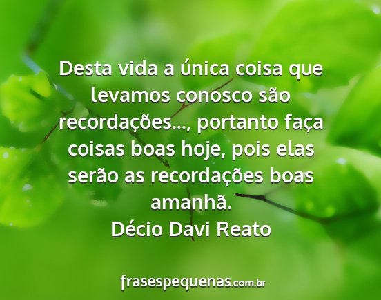 Desta vida a única coisa que levamos conosco são recordações..., portanto faça coisas boas hoje, pois elas serão as recordações boas amanhã.Décio Davi Reato