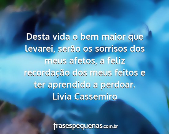Desta vida o bem maior que levarei, serão os sorrisos dos meus afetos, a feliz recordação dos meus feitos e ter aprendido a perdoar.Livia Cassemiro