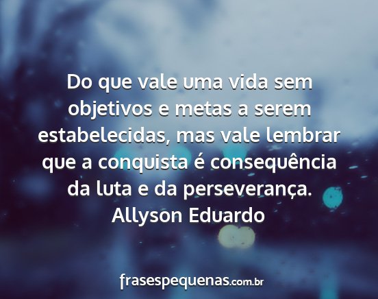 Do que vale uma vida sem objetivos e metas a serem estabelecidas, mas vale lembrar que a conquista é consequência da luta e da perseverança.Allyson Eduardo