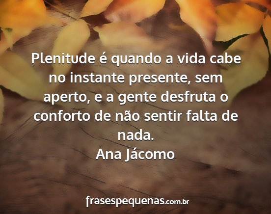Plenitude é quando a vida cabe no instante presente, sem aperto, e a gente desfruta o conforto de não sentir falta de nada.Ana Jácomo