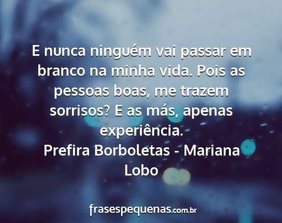 E nunca ninguém vai passar em branco na minha vida. Pois as pessoas boas, me trazem sorrisos? E as más, apenas experiência.Prefira Borboletas - Mariana Lobo
