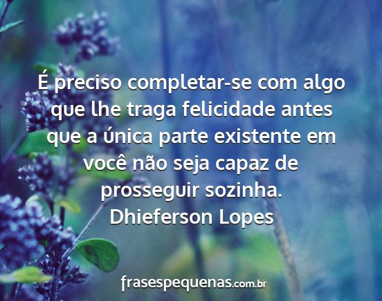 É preciso completar-se com algo que lhe traga felicidade antes que a única parte existente em você não seja capaz de prosseguir sozinha.Dhieferson Lopes