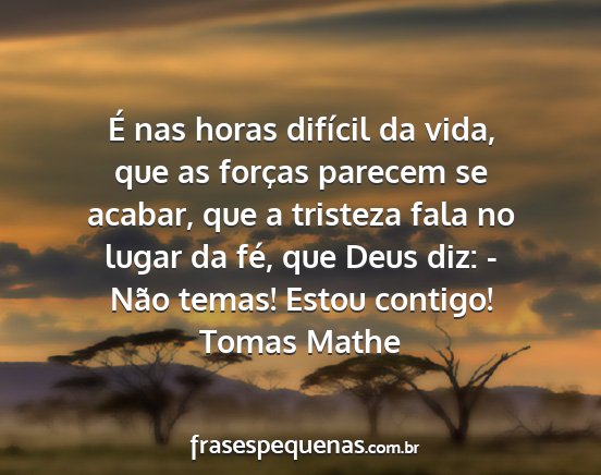 É nas horas difícil da vida, que as forças parecem se acabar, que a tristeza fala no lugar da fé, que Deus diz: - Não temas! Estou contigo!Tomas Mathe
