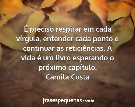 É preciso respirar em cada vírgula, entender cada ponto e continuar as reticiências. A vida é um livro esperando o próximo capítulo.Camila Costa