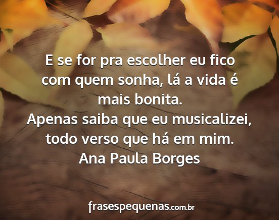 Apenas saiba que eu musicalizei, todo verso que há em mim.Ana Paula Borges