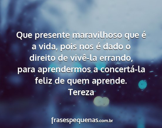 Que presente maravilhoso que é a vida, pois nos é dado o direito de vivê-la errando, para aprendermos a concertá-la feliz de quem aprende.Tereza