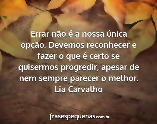 Errar não é a nossa única opção. Devemos reconhecer e fazer o que é certo se quisermos progredir, apesar de nem sempre parecer o melhor.Lia Carvalho