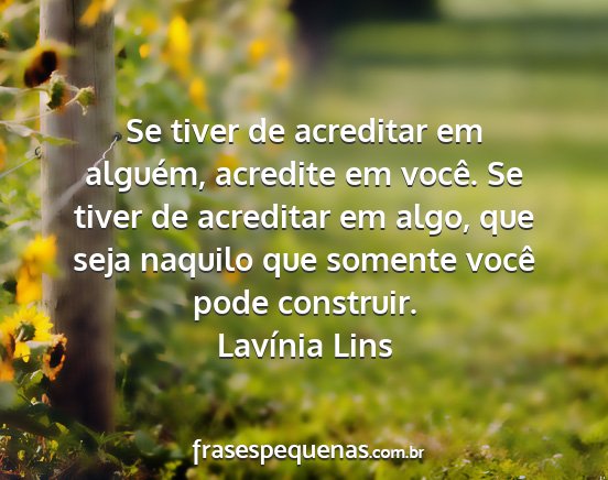 Se tiver de acreditar em alguém, acredite em você. Se tiver de acreditar em algo, que seja naquilo que somente você pode construir.Lavínia Lins
