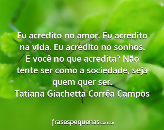 Eu acredito no amor. Eu acredito na vida. Eu acredito no sonhos. E você no que acredita? Não tente ser como a sociedade, seja quem quer ser.Tatiana Giachetta Corrêa Campos