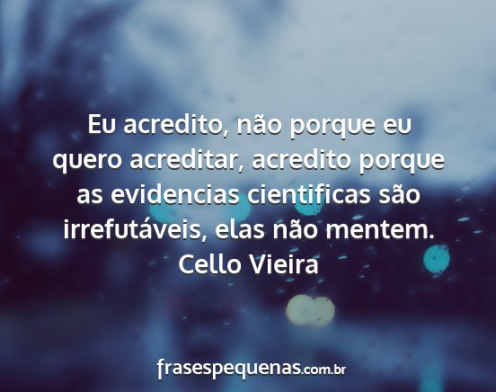 Eu acredito, não porque eu quero acreditar, acredito porque as evidencias cientificas são irrefutáveis, elas não mentem.Cello Vieira