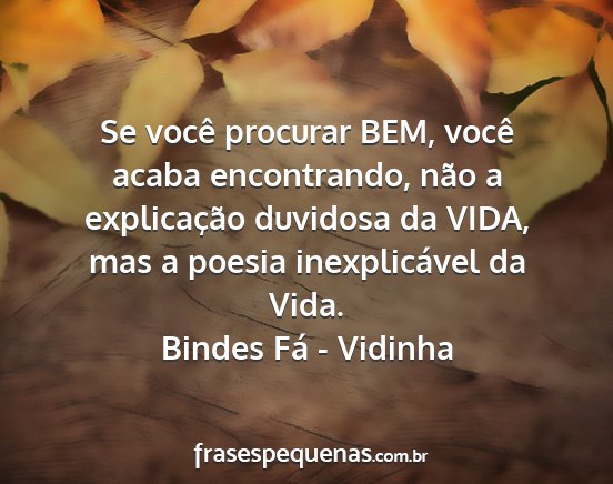 Se você procurar BEM, você acaba encontrando, não a explicação duvidosa da VIDA, mas a poesia inexplicável da Vida.Bindes Fá - Vidinha