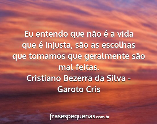 Eu entendo que não é a vida que é injusta, são as escolhas que tomamos que geralmente são mal feitas.Cristiano Bezerra da Silva - Garoto Cris