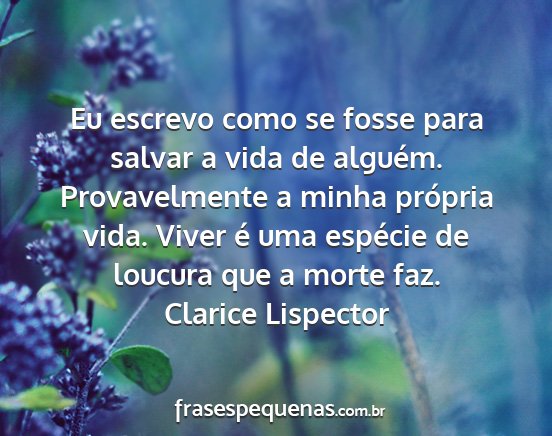 Eu escrevo como se fosse para salvar a vida de alguém. Provavelmente a minha própria vida. Viver é uma espécie de loucura que a morte faz.Clarice Lispector