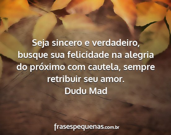 Seja sincero e verdadeiro, busque sua felicidade na alegria do próximo com cautela, sempre retribuir seu amor.Dudu Mad