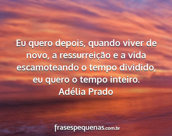 Eu quero depois, quando viver de novo, a ressurreição e a vida escamoteando o tempo dividido, eu quero o tempo inteiro.Adélia Prado