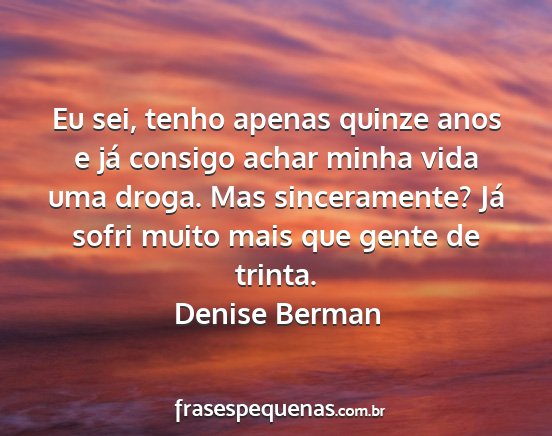 Eu sei, tenho apenas quinze anos e já consigo achar minha vida uma droga. Mas sinceramente? Já sofri muito mais que gente de trinta.Denise Berman