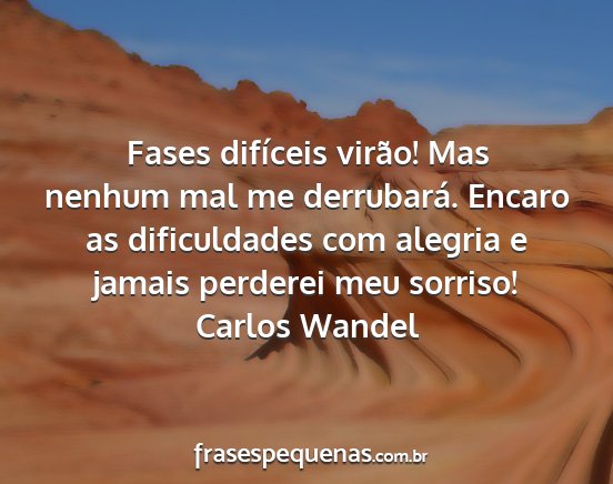 Fases difíceis virão! Mas nenhum mal me derrubará. Encaro as dificuldades com alegria e jamais perderei meu sorriso!Carlos Wandel