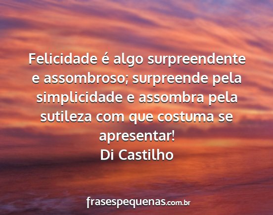 Felicidade é algo surpreendente e assombroso; surpreende pela simplicidade e assombra pela sutileza com que costuma se apresentar!Di Castilho