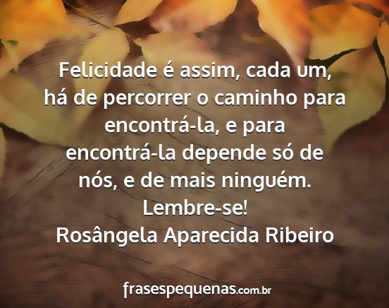 Felicidade é assim, cada um, há de percorrer o caminho para encontrá-la, e para encontrá-la depende só de nós, e de mais ninguém. Lembre-se!Rosângela Aparecida Ribeiro