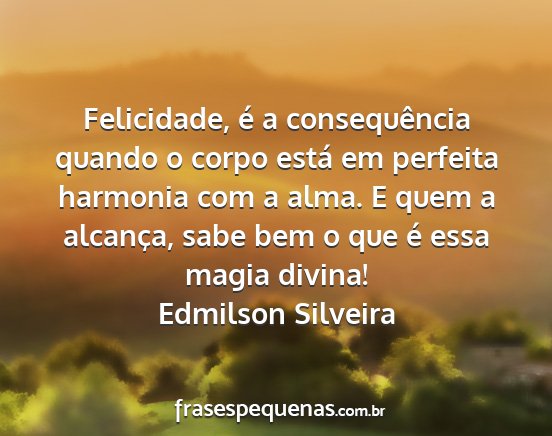 Felicidade, é a consequência quando o corpo está em perfeita harmonia com a alma. E quem a alcança, sabe bem o que é essa magia divina!Edmilson Silveira