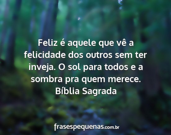 Feliz é aquele que vê a felicidade dos outros sem ter inveja. O sol para todos e a sombra pra quem merece.Bíblia Sagrada