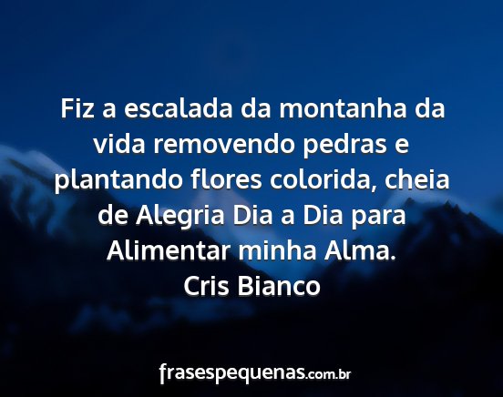 Fiz a escalada da montanha da vida removendo pedras e plantando flores colorida, cheia de Alegria Dia a Dia para Alimentar minha Alma.Cris Bianco