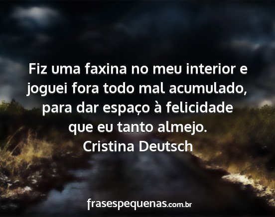 Fiz uma faxina no meu interior e joguei fora todo mal acumulado, para dar espaço à felicidade que eu tanto almejo.Cristina Deutsch
