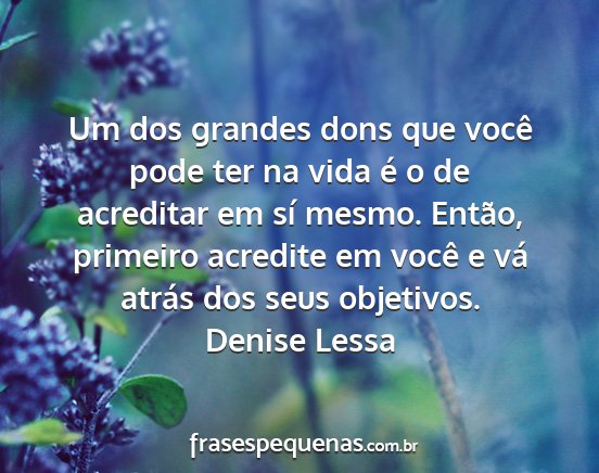 Um dos grandes dons que você pode ter na vida é o de acreditar em sí mesmo. Então, primeiro acredite em você e vá atrás dos seus objetivos.Denise Lessa