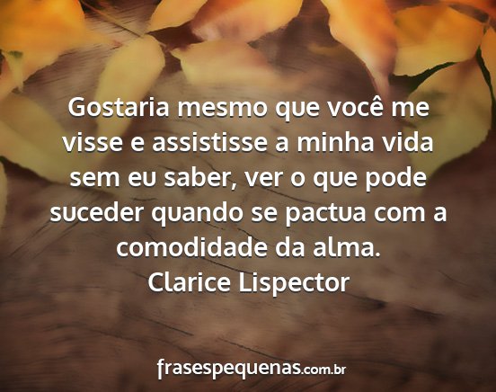 Gostaria mesmo que você me visse e assistisse a minha vida sem eu saber, ver o que pode suceder quando se pactua com a comodidade da alma.Clarice Lispector