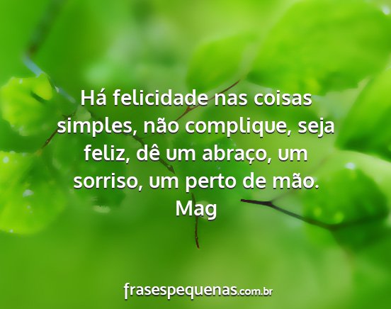 Há felicidade nas coisas simples, não complique, seja feliz, dê um abraço, um sorriso, um perto de mão.Mag