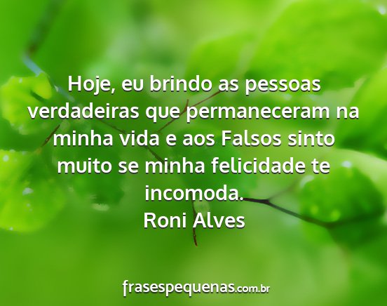 Hoje, eu brindo as pessoas verdadeiras que permaneceram na minha vida e aos Falsos sinto muito se minha felicidade te incomoda.Roni Alves
