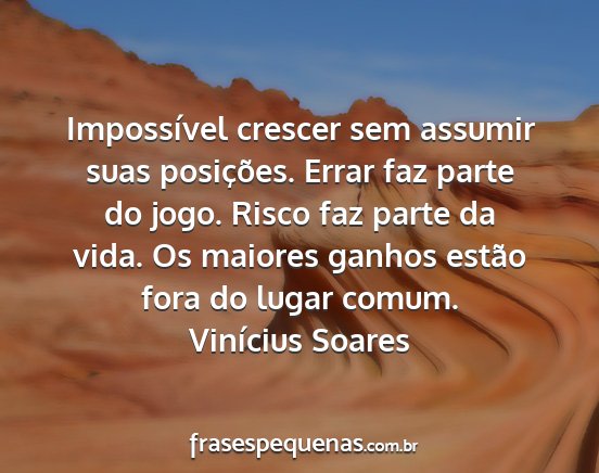 Impossível crescer sem assumir suas posições. Errar faz parte do jogo. Risco faz parte da vida. Os maiores ganhos estão fora do lugar comum.Vinícius Soares