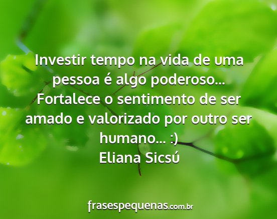 Investir tempo na vida de uma pessoa é algo poderoso... Fortalece o sentimento de ser amado e valorizado por outro ser humano... :)Eliana Sicsú