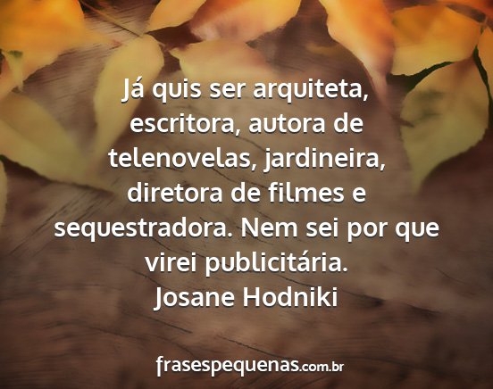 Já quis ser arquiteta, escritora, autora de telenovelas, jardineira, diretora de filmes e sequestradora. Nem sei por que virei publicitária.Josane Hodniki