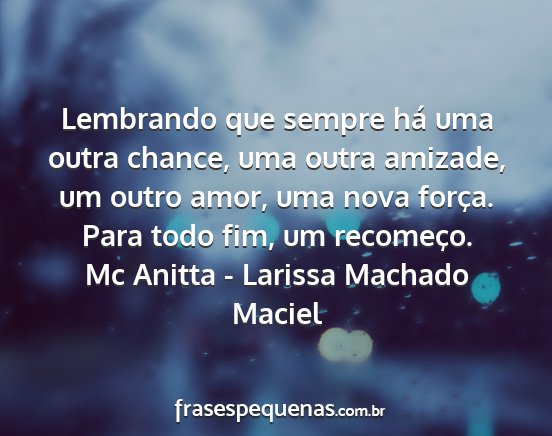 Lembrando que sempre há uma outra chance, uma outra amizade, um outro amor, uma nova força. Para todo fim, um recomeço.Mc Anitta - Larissa Machado Maciel