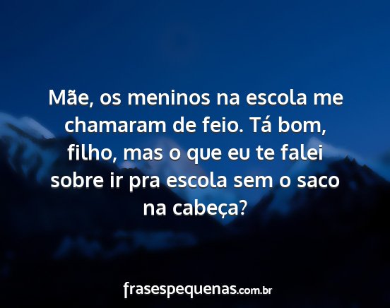 Mãe, os meninos na escola me chamaram de feio. Tá bom, filho, mas o que eu te falei sobre ir pra escola sem o saco na cabeça?