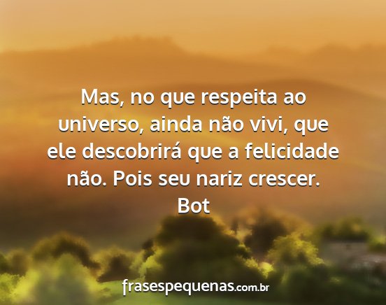 Mas, no que respeita ao universo, ainda não vivi, que ele descobrirá que a felicidade não. Pois seu nariz crescer.Bot