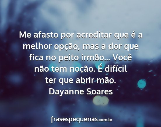 Me afasto por acreditar que é a melhor opção, mas a dor que fica no peito irmão... Você não tem noção. É difícil ter que abrir mão.Dayanne Soares