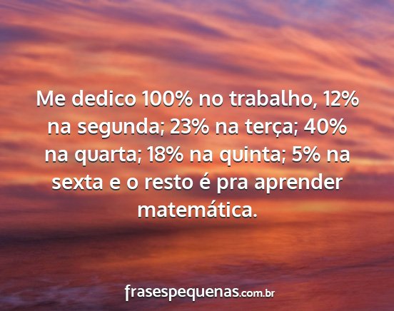Me dedico 100% no trabalho, 12% na segunda; 23% na terça; 40% na quarta; 18% na quinta; 5% na sexta e o resto é pra aprender matemática.