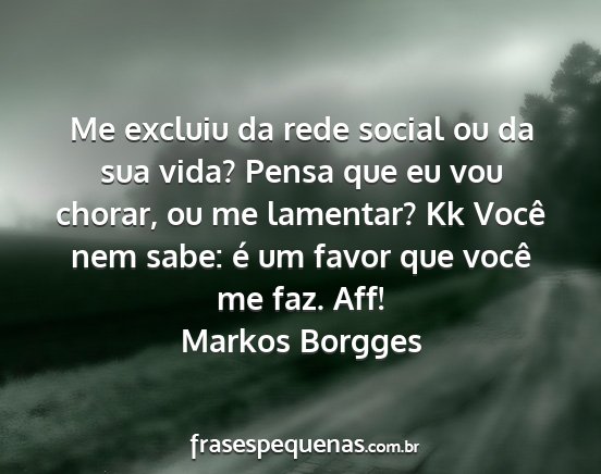 Me excluiu da rede social ou da sua vida? Pensa que eu vou chorar, ou me lamentar? Kk Você nem sabe: é um favor que você me faz. Aff!Markos Borgges