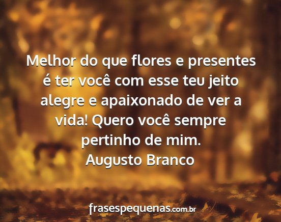 Melhor do que flores e presentes é ter você com esse teu jeito alegre e apaixonado de ver a vida! Quero você sempre pertinho de mim.Augusto Branco